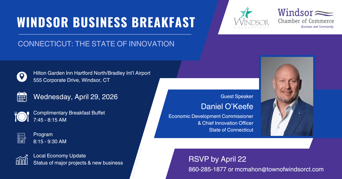 The Windsor Economic Development Commission, in partnership with the Windsor Chamber of Commerce, is pleased to host the Annual Windsor Business Breakfast on Wednesday, April 29th.