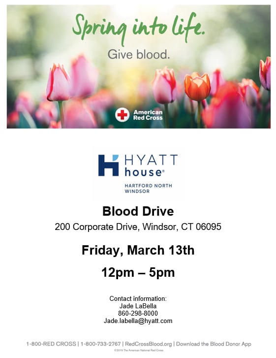 Spring Blood Drive at the HYATT House Hotel located at 200 Corporate Drive, Windsor, CT 06095.