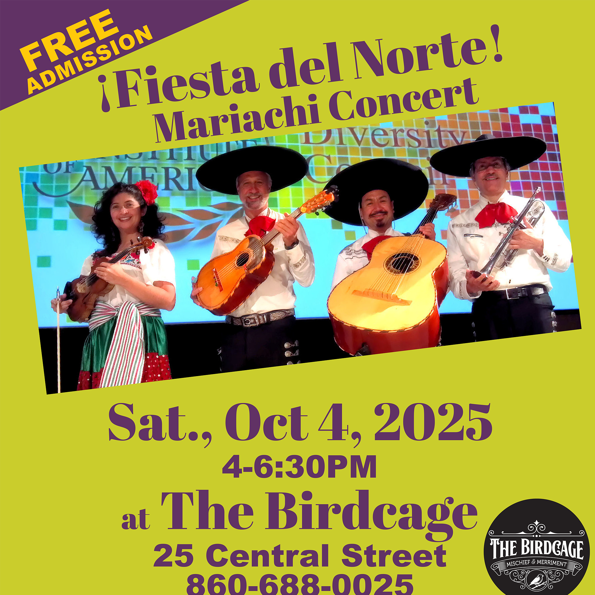 In celebration of National Hispanic Heritage Month, the Windsor Art Center is proud to present Nosotros: A Celebration of Latin and Hispanic Culture. Nosotros will also feature a special, music and dance event featuring Fiesta Del Norte Mariachi Band. Free entry to this event held at The Birdcage, 25 Central Street, Windsor, CT. Great for all ages. Food trucks and drinks for sale at the venue. Come celebrate and experience the fun. A collaboration of The Birdcage and The Windsor Art Center. Correct date for event is Sat., Oct. 4th