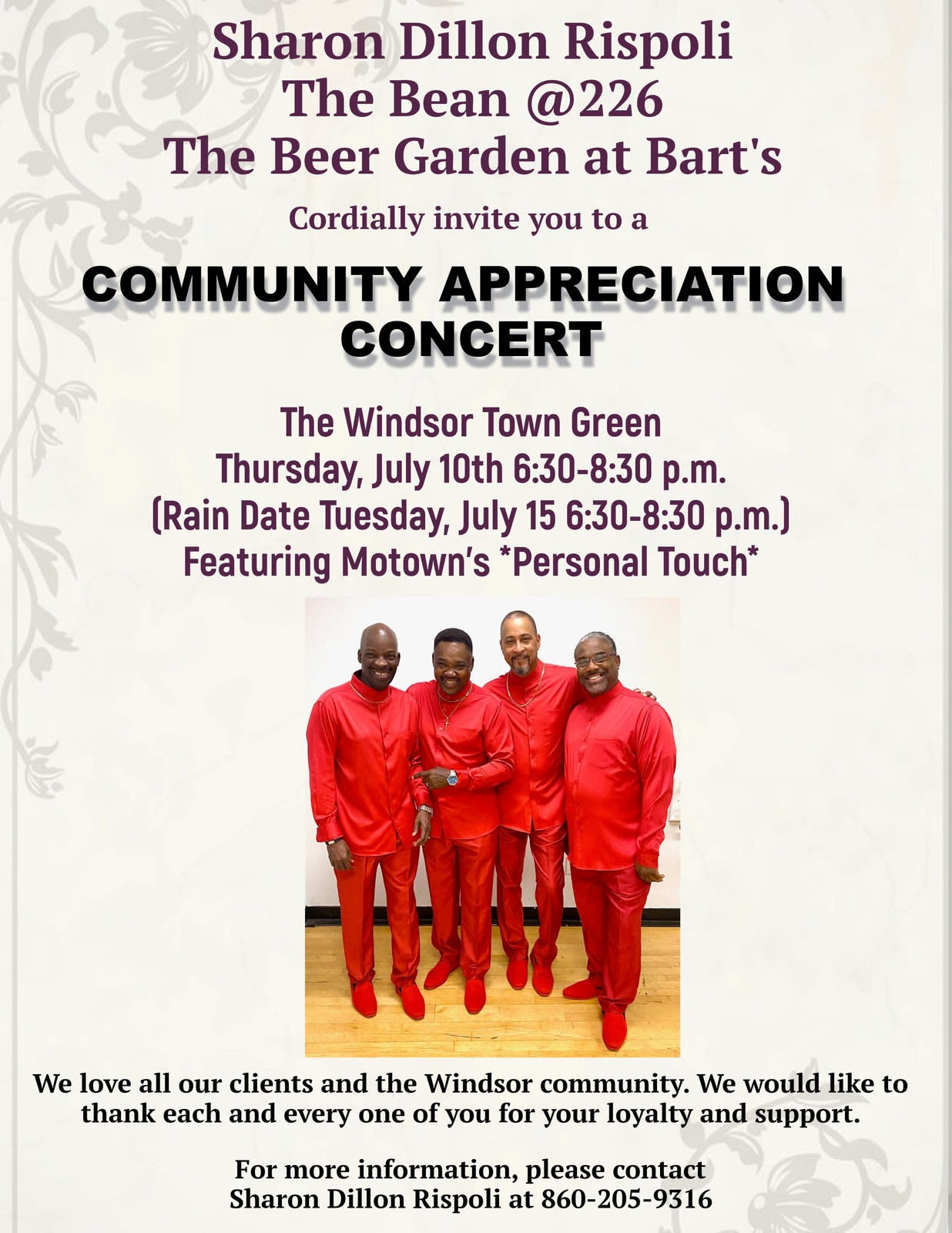 Come out for Summer Concerts on the Windsor Town Green on Thursday evenings from 6:30 – 8:30 PM from July through August. Rain dates are always the following Tuesday. Brought to you by First Town Downtown. 2025 CONCERT SCHEDULE !! Thursdays 6:30pm – 8:30pm on the Windsor Town Green from July 10th through August 28th Rain dates are always the following Tuesday. 7/10/2025 Personal Touch 7/17/2025 Nekita Waller 7/24/2025 Still Kicking with the Big City Horns 7/31/2025 102 Army Band/Rockville 8/07/2025 Whiskey Traveler 8/14/2025 Farmington Valley Band 8/21/2025 Giosa-Varela Band 8/28/2025 Avenue Groove